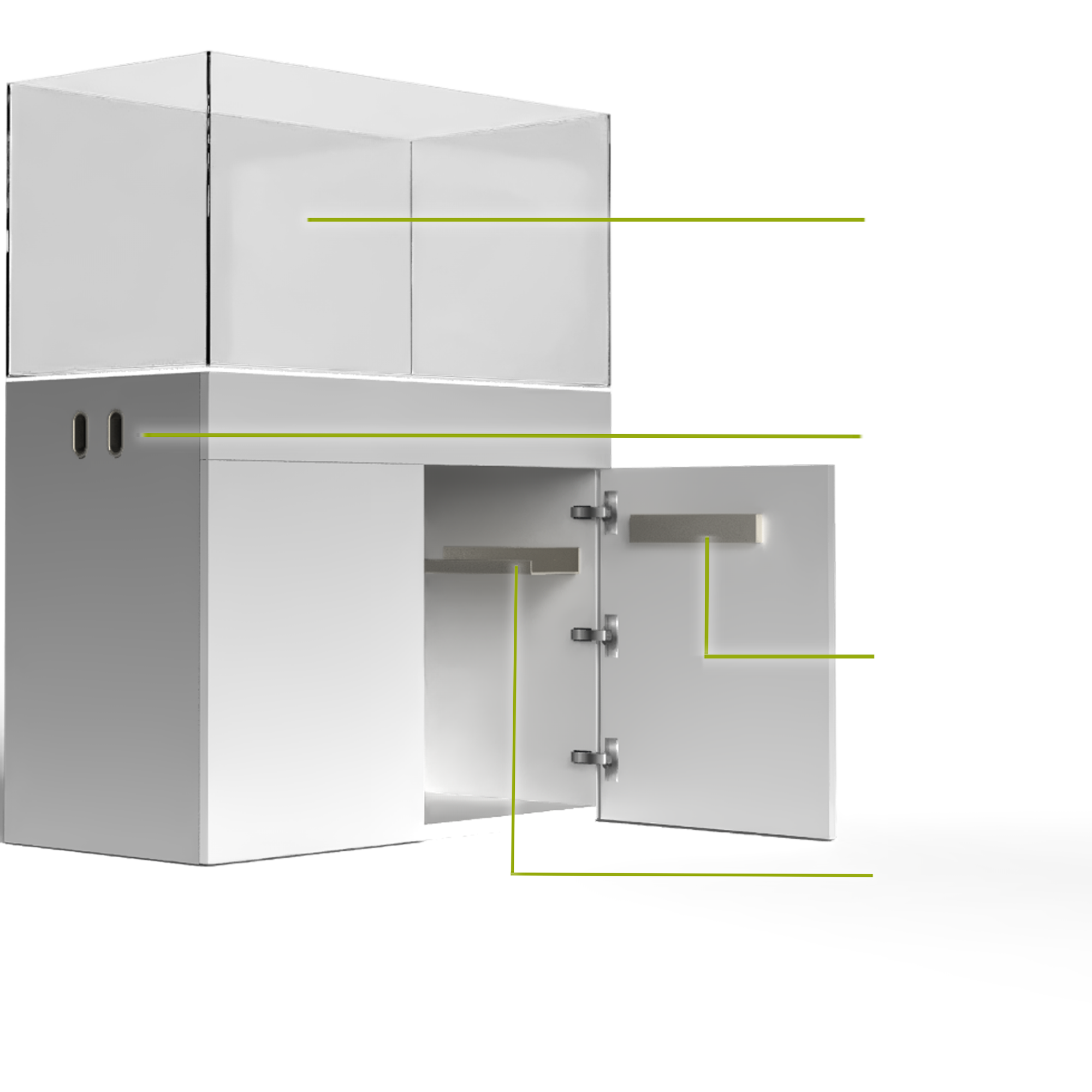 Mein Cabinet garantiert dir, dass dein Aquarium nicht nur schön präsentiert wird, sondern auch auf einer soliden Basis steht. Hergestellt in echter Schweizer Handwerkskunst, ist der Aquariumunterschrank robust und stabil gebaut mit 19mm Presssplanplatten in verleimter Dübel Bauweise. Es gibt keine offenen Innenflächen, und alles ist mit hochwertigem ABS Dekor veredelt. Mit seinem modernen, abgesetzten Design und den zwei großen Öffnungen auf der Rückseite für Schläuche, bietet der Aquarium Unterbau nicht nur eine attraktive Optik, sondern auch eine praktische Handhabung.