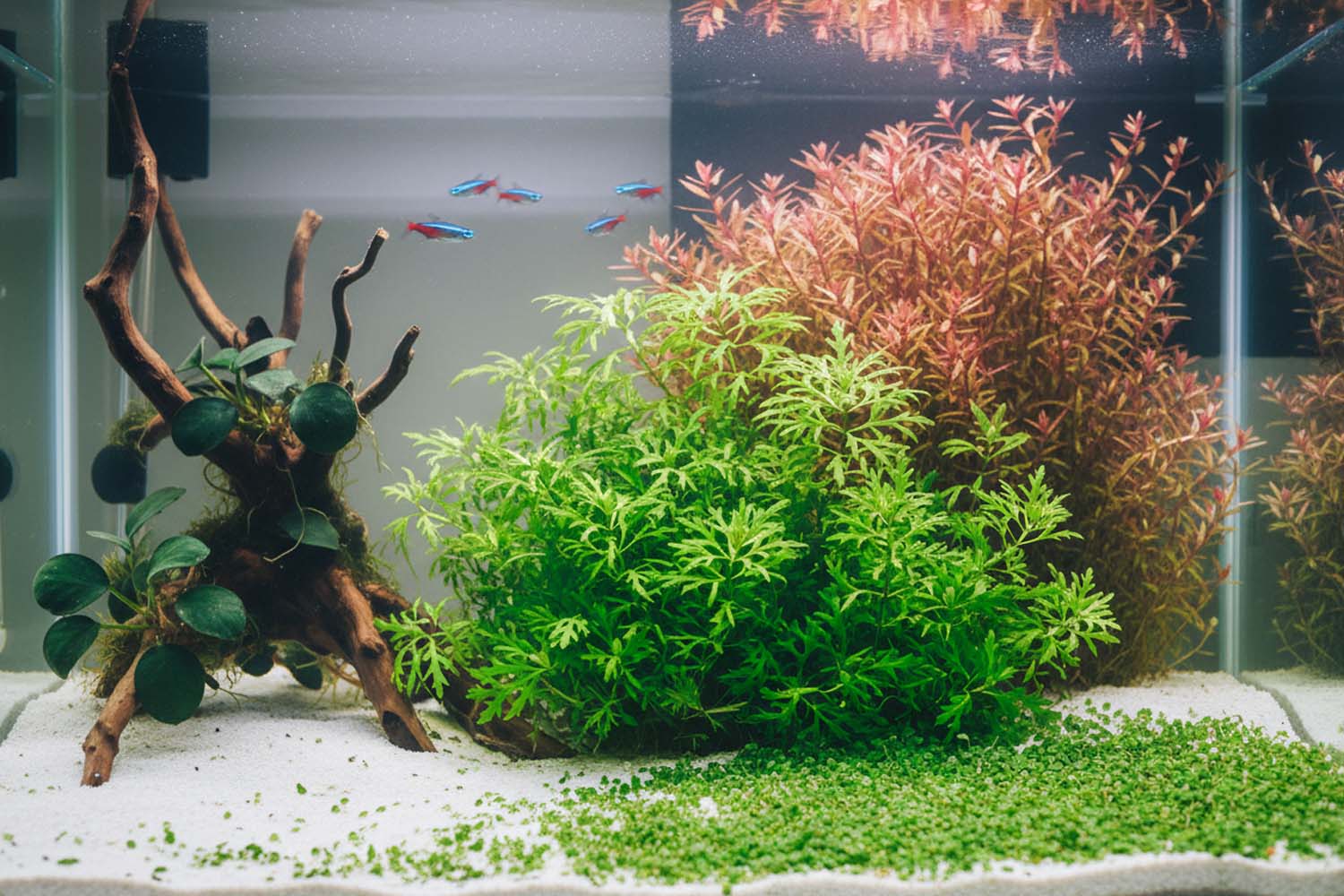Das untenstehende Layout soll dir als Inspiration dienen, wie deine neuen Wasserpflanzen im Aquarium wirken können. In der folgenden Tabelle findest du außerdem drei weitere passende Wasserpflanzen, die im Layout präsentiert werden.